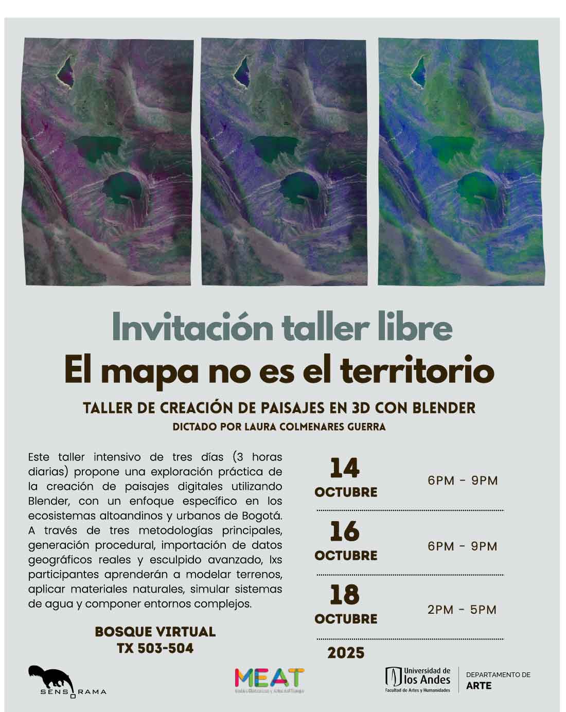 Este taller intensivo de tres días (3 horas diarias) propone una exploración práctica de la creación de paisajes digitales utilizando Blender, con un enfoque en los ecosistemas altoandinos y urbanos de Bogotá.